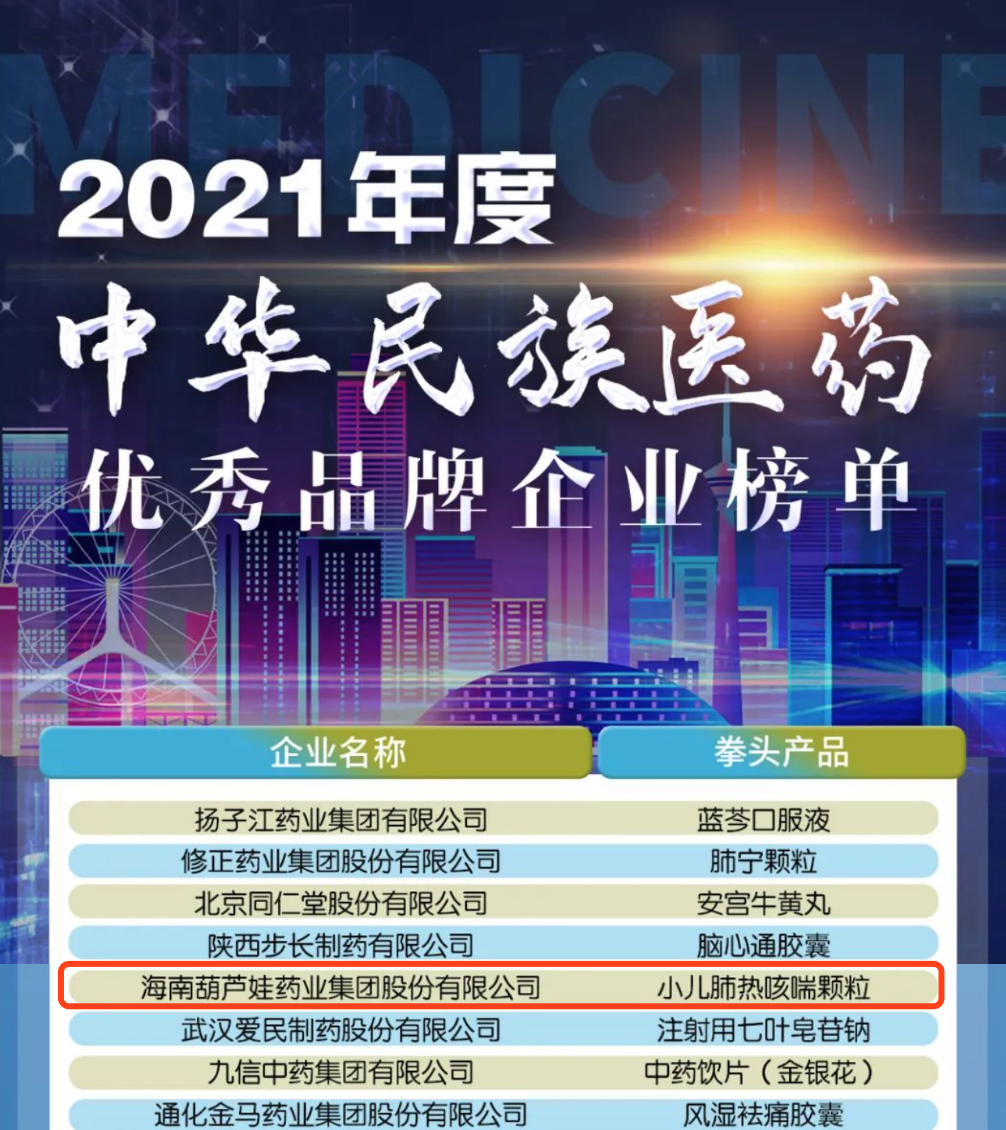 12月29日,全国工商联医药业商会发布了“2021年度中华民族医药优秀品牌企业榜单”,人生就是博药业集团凭借黄金单品小儿肺热咳喘颗粒(4克)实力登榜。